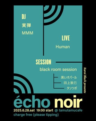前回も大盛況だったKuroi Opal主催のParty『Kuroi Black presents écho noir』 早くも2回目の開催。DJに京都より実弾、最近各所で活動をお見かけするMMM(みみみ)、ライブにHuman、セッションとして元black root(s) crew の構成員だった田上敦巳とのbr(s)c前身ユニットblack roomとベアーズスタッフタンツボによる電子対談!入場無料の投げ銭Partyですのでお気軽にどうぞ!
