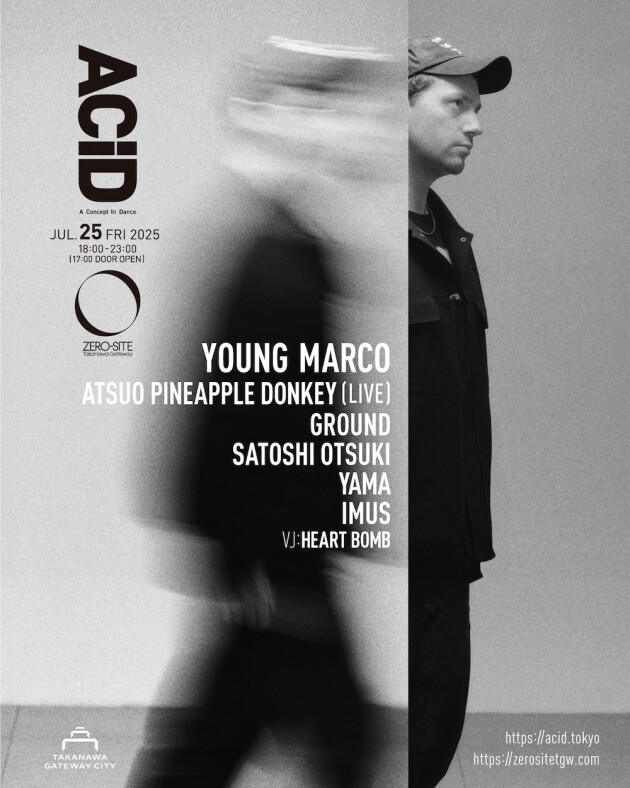 本公演は、The Chemical BrothersやFatboy Slim、Peggy Gou、Nina Kraviz、Sara Landryといっ た世界的アーティストを招聘してきた注目パーティーシリーズACiDによるサマースペシャ ル。“ACiD SUMMER BASH”と題した今回のイベントでは、Young Marcoによるトランシーで高揚感あふれるDJセットが披露される予定だ。