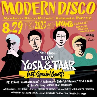In addition to a full live set featuring guest vocalists, YOSA & TAAR will be joined by a stellar lineup including Modern Disco regulars and special guests such as Shinichi Osawa, Shokuhin Matsuri a.k.a. FOODMAN, FELINE,