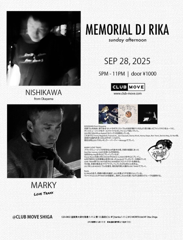 80年代から東京や関西で活動した伝説的フィメールDJ RIKAの二周忌の命日となる日曜に、晩年にホームグラウンドとしていた滋賀の老舗CLUB MOVEでメモリアルパーティーを開催。息子であるRyotaが自らの人脈も活かして選び、彼女が行動を共にしたベテランDJを招き、往年のParadise GarageやThe Loftのスタイルを再現しながらハウスミュージックの奥深い歴史も含めて振り返ろう。