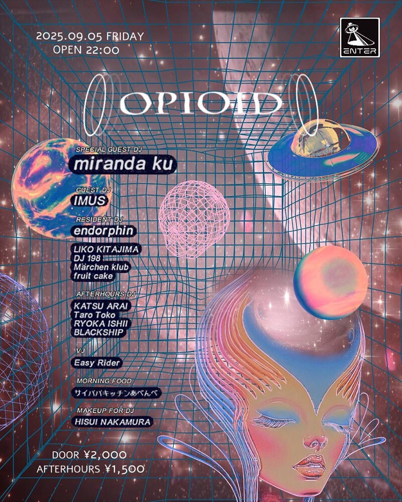 着実にその存在感を示し頭角を表す気鋭のFemale DJ "endorphin"が"ダンスフロアに鎮痛と多幸をもたらす実験"をコンセプトに、これまでMari Sakurai , KOPYなどをゲストに迎え開催して来たパーティー "OPIOID"が遂に新世代東京カルチャーの震源地ENTERの週末枠に移動!記念すべき初回は、台湾Taipeiの名所PAWNSHOPにも度々出演し、その美しい外見と共に放たれる出音は、TechnoからTranceまで切れ目無く自在に操りストーリー性の高い展開でフロアを昇天へと導くFemale DJ "miranda ku"が日本初出演!更にそのセンスと没入感の高い選曲で定評が高くFUTURE TERROR 2023に出演するなど国内最注目のFemale DJ "IMUS"が出演!またendorphinの地元宇都宮から、常に音の深みと新しい発見を提供してくれる敬愛する先輩DJ 198を召喚。そしてその実験のイメージをビジュアルで提供する心友"VJ EasyRider"が出演!耳を澄まし心を解き放ち巻き起こる化学反応を是非体感しに来て欲しい!また、AFTER HOURSには、レギュラータイムの没入感ある空間から解放し、ミニマル且つグルーヴィーな選曲で定評の高いTechhouseマエストロ3組、KATSU ARAI, BLACKSHIP, Taro Tokoを召喚。大トリはendorphin長年の盟友RYOKA ISHIIが出演。11時間という長い実験の先にある"新しい答え"を参加者全員と共に創造したい!