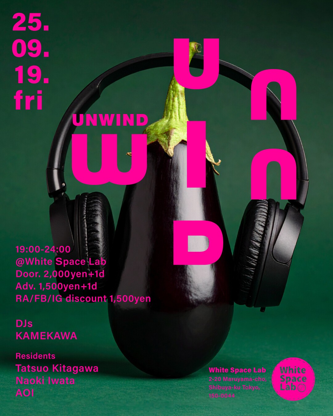 渋谷のアンダーグラウンドVenue @White Space Labでのディープハウスパーティ ”UNWIND” 心地良いディープハウスを軸にOrganic house / Downtempo, deep tech, electronica, ambientなどクロスオーバーに新しさと実験的且つモダンなサウンドを心地良く体感できるディープハウスパーティ”UNWIND”