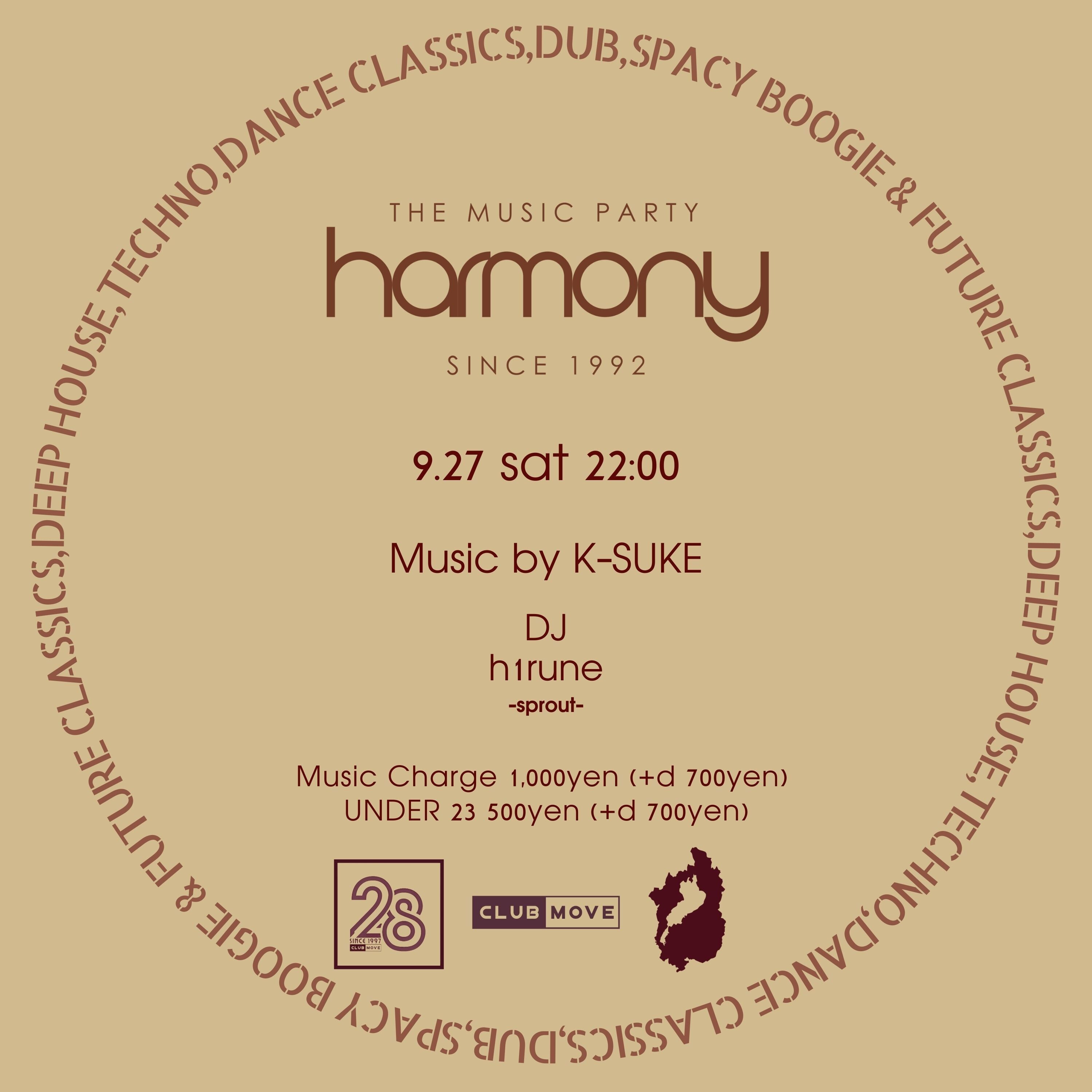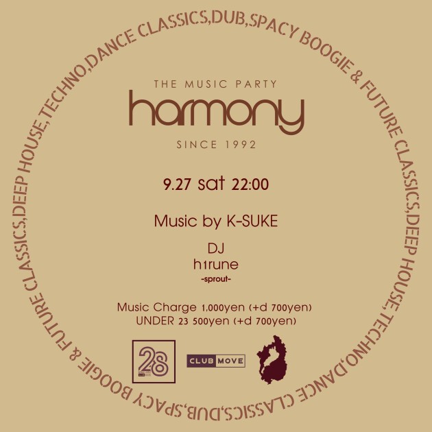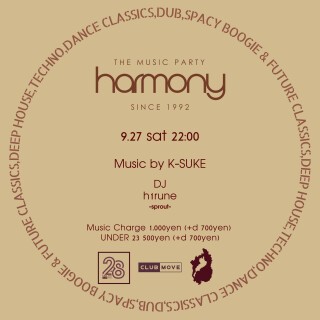 9月のHARMONYはMOVEにて毎月第4月に開催の関西界隈のニュージェネレーションDJ達が中心のパーティー "sprout" のメンバー "h1rune" にオープンDJを託し、
