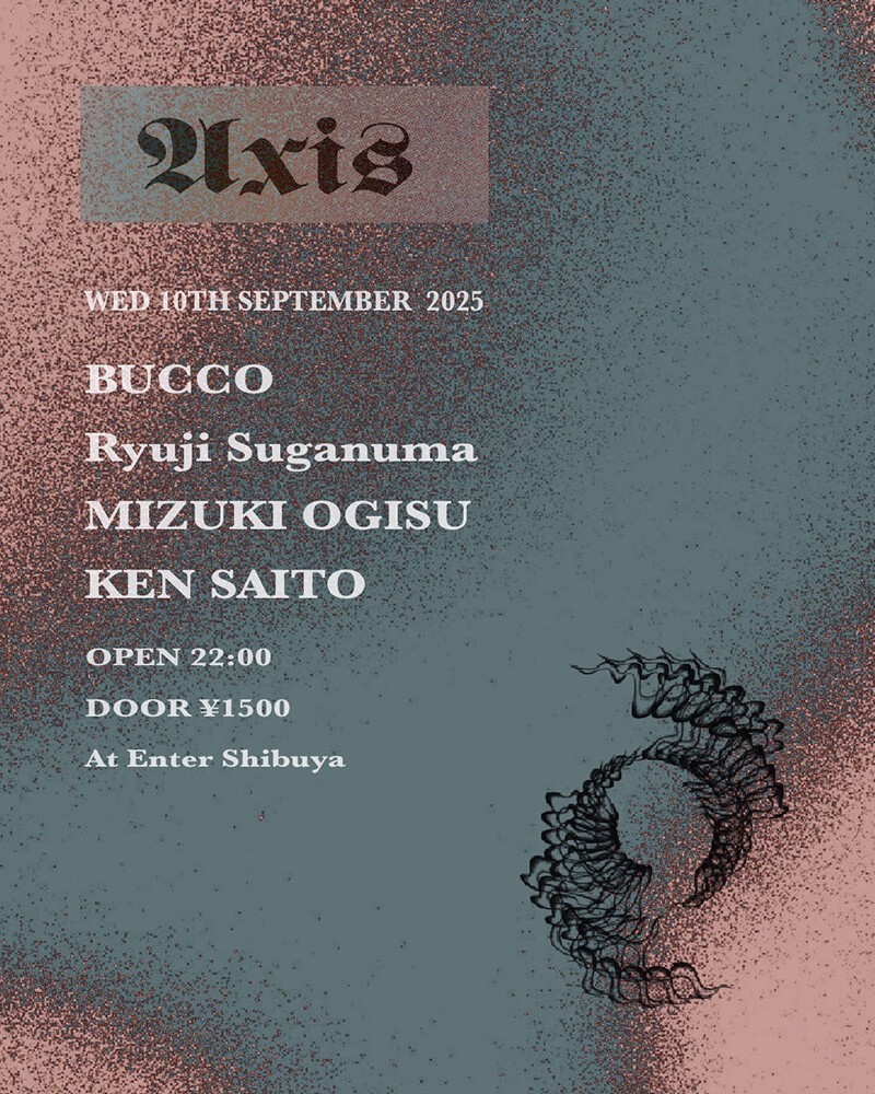 KEN SAITOが仕掛けるAxis。2022年からDJ活動を開始しEnterスタッフ、北千住のレコードショップletus recycle centerで現場経験を積む彼は、インプットとアウトプットを相互に繰り返し、多様な哲学を持つ人々が集まる東京で、徐々に頭角を表している。今回はMODULATION NOW!やjimmyの活動で知られる関西のダークホースBUCCOを筆頭に、IN-SYNC、SOFT&WEETを主催するRyuji Suganuma、Glimmerを主催するMizuki Ogisuを招き入れる。