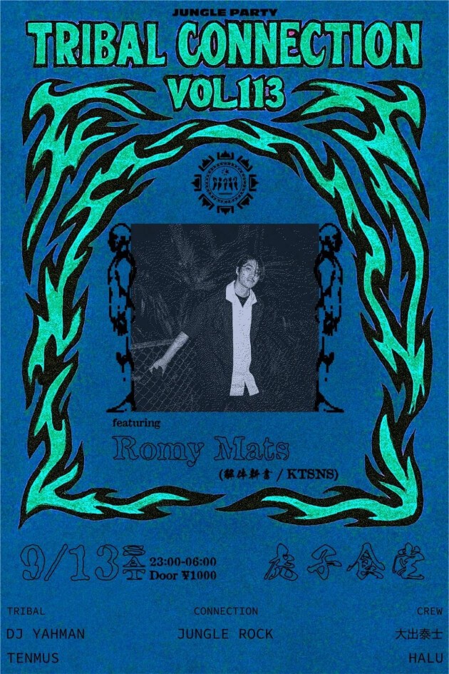【Tribal Connection】 Soundsystemの重低音、Raggaの激熱咆哮と存在感、Jazz/Soul/R&B/Funk/Hiphopなどの刻みに即興感それと同時にグルーヴ、HouseやTechnoの反復の快楽、Raveの天井知らずの高揚感、各地のメロディにリズム、生~電子楽器など、様々な音の要素を吸収しそれらを疾走感あふれるブレイクビーツと重低音に乗せて一気に放ち音の密林へ誘う血湧き肉躍る雑食ダンスミュージック=JUNGLEを中心に、黄金のBass CultureとRave Cultureを結びつけ、熱い音を楽しめるパーティー、それがTribal Connection。 現在、Tribal Connectionは、DJ YAHMAN、JUNGLE ROCK、大出泰士、Tenmus、HALUの5人で構成。各自のバックグラウンドを軸に多角的なジャングル活動を行い、JUNGLE PARTY Tribal Connectionを奇数月第2土曜に渋谷の虎子食堂にて開催中。2023年11月の開催通算100回目/創立14周年祭は、開始直後に満員御礼。2024年、創立15周年。