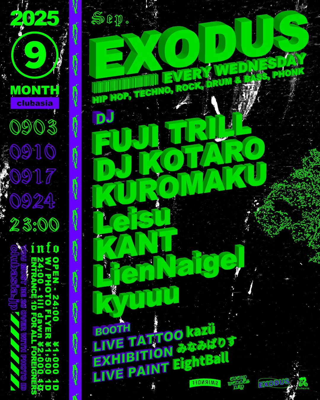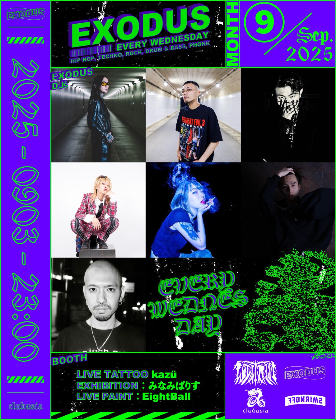 ✸ FUJI TRILLをはじめ多方面に活躍するDJ , BeatMakerが毎週水曜の渋谷の夜をにぎわす通称"エクソ"。LIVE PAINT, LIVE TATTOO, EXHIBITIONも隔週充実したLINEUPでお届け。毎週開催を続け9月はVol.200も超える。