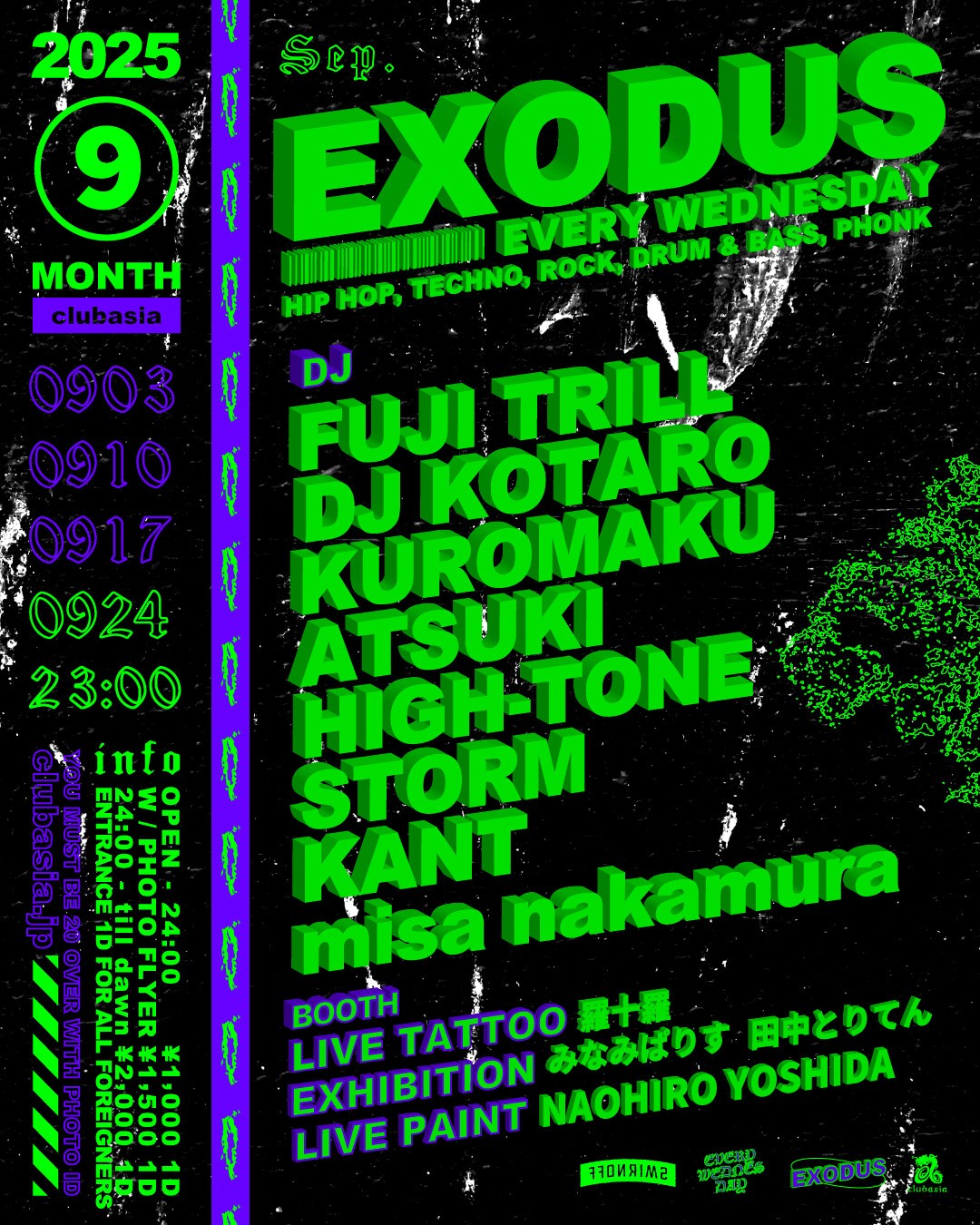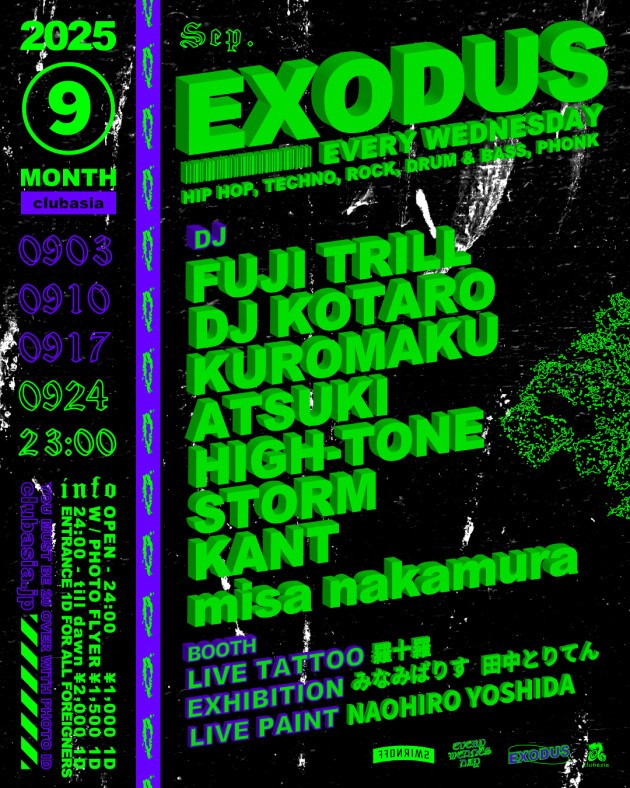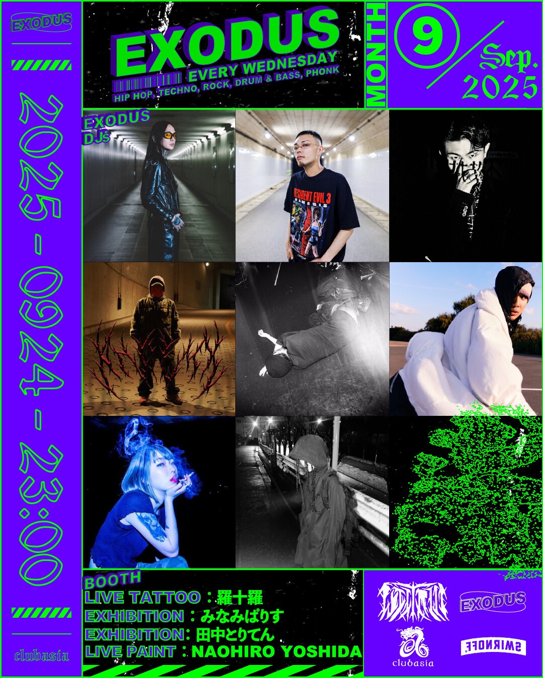 ✸ FUJI TRILLをはじめ多方面に活躍するDJ , BeatMakerが毎週水曜の渋谷の夜をにぎわす通称"エクソ"。LIVE PAINT, LIVE TATTOO, EXHIBITIONも隔週充実したLINEUPでお届け。毎週開催を続け9月はVol.200も超える。