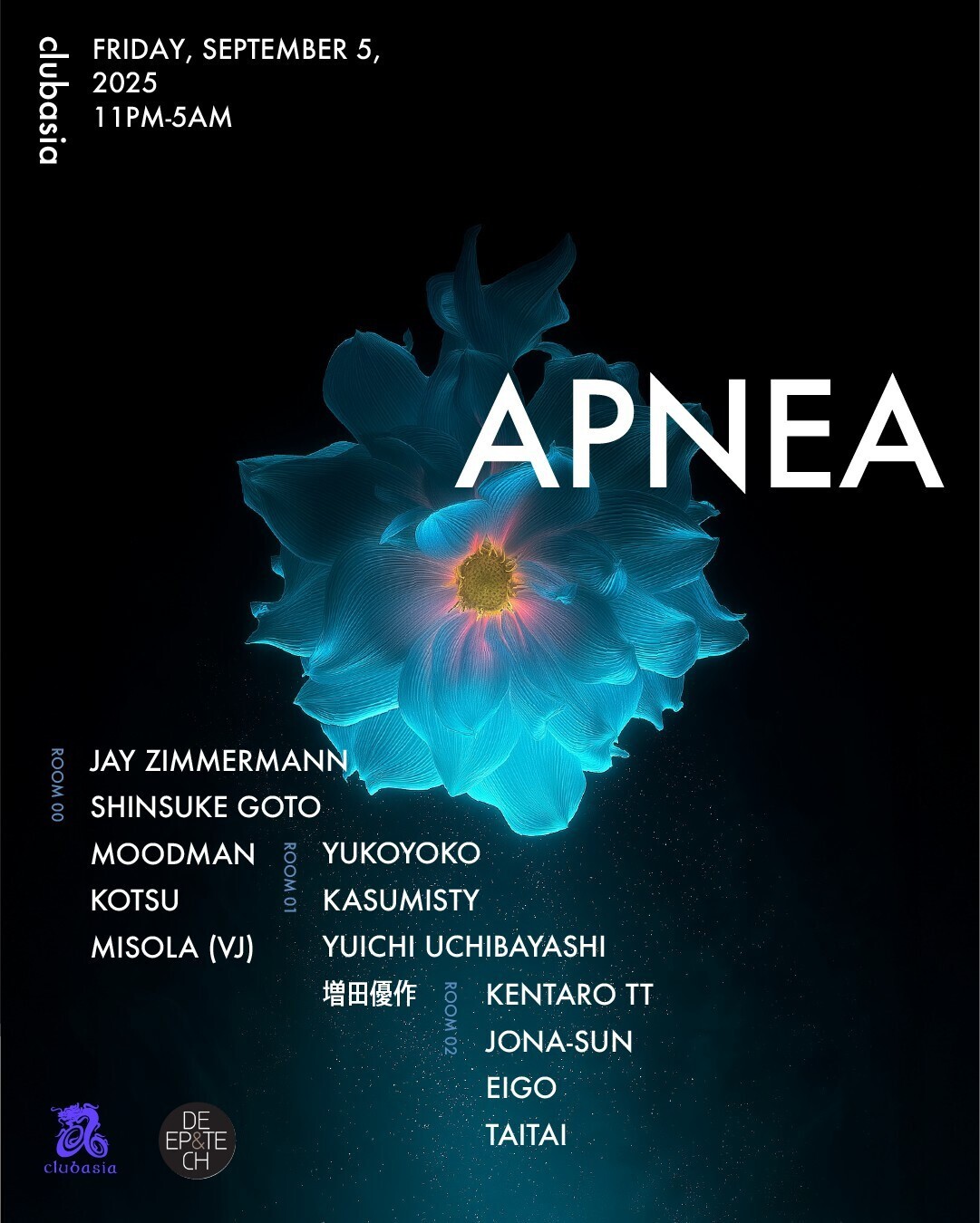On Friday, September 5, descend into the sonic depths of APNEA—a deep house and deeper techno gathering that abandons the superficial in favor of raw groove and immersive rhythm. Set across three rooms at the iconic clubasia in Shibuya, this all-night session is built for those who seek hypnotic pulse over hype, vibration over vanity. No gimmicks. No fluff. Just pulse-pounding grooves that lock you into the moment and carry you until sunrise.