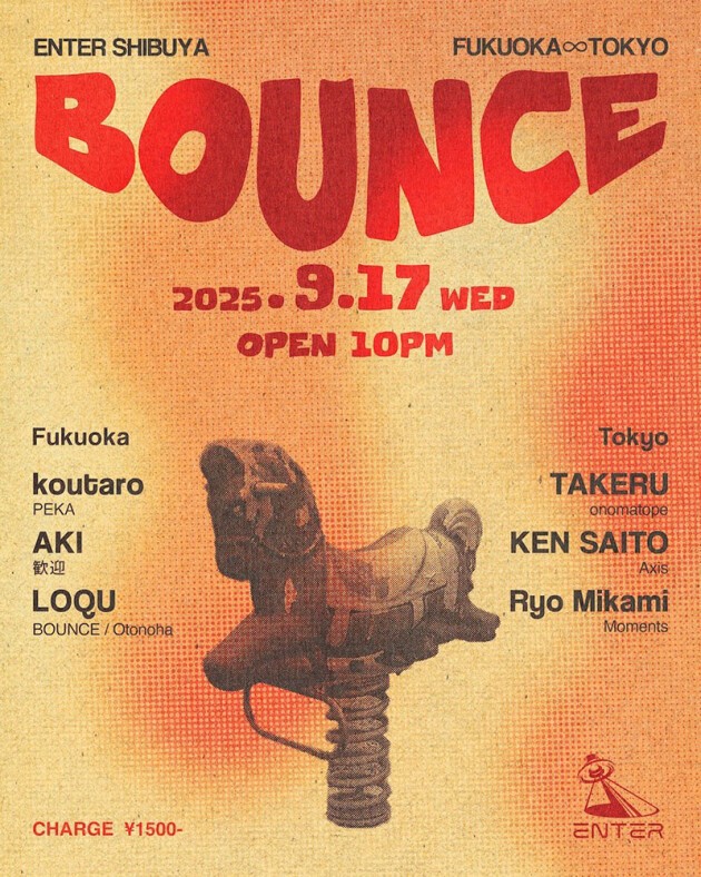 今回2度目となる東京ENTERでのBOUNCE、福岡と東京で活躍する馴染み深いDJと共に東京×福岡のホットなグルーヴをお届けします!