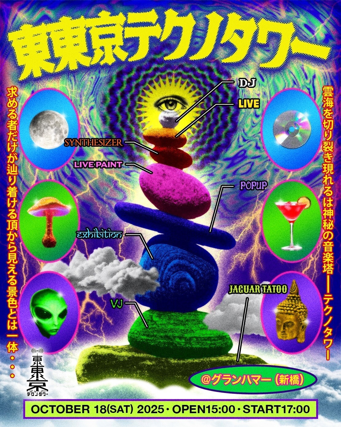 **Higashi Tokyo TECHNO TOWER** is the forefront of the East Tokyo dance floor, originating from Techno and Electro music, and crossing over various electronic sounds and new styles.
