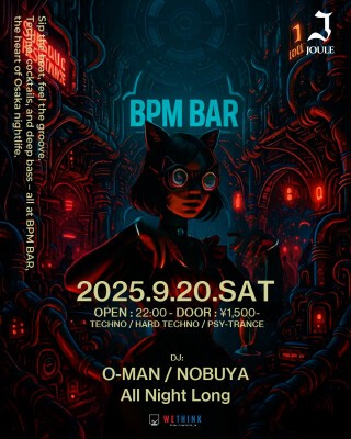 At BPM BAR Osaka, O-MAN and NOBUYA take over with an ALL NIGHT LONG SET! From techno to psy-trance and afrohouse, experience a sonic journey all night.