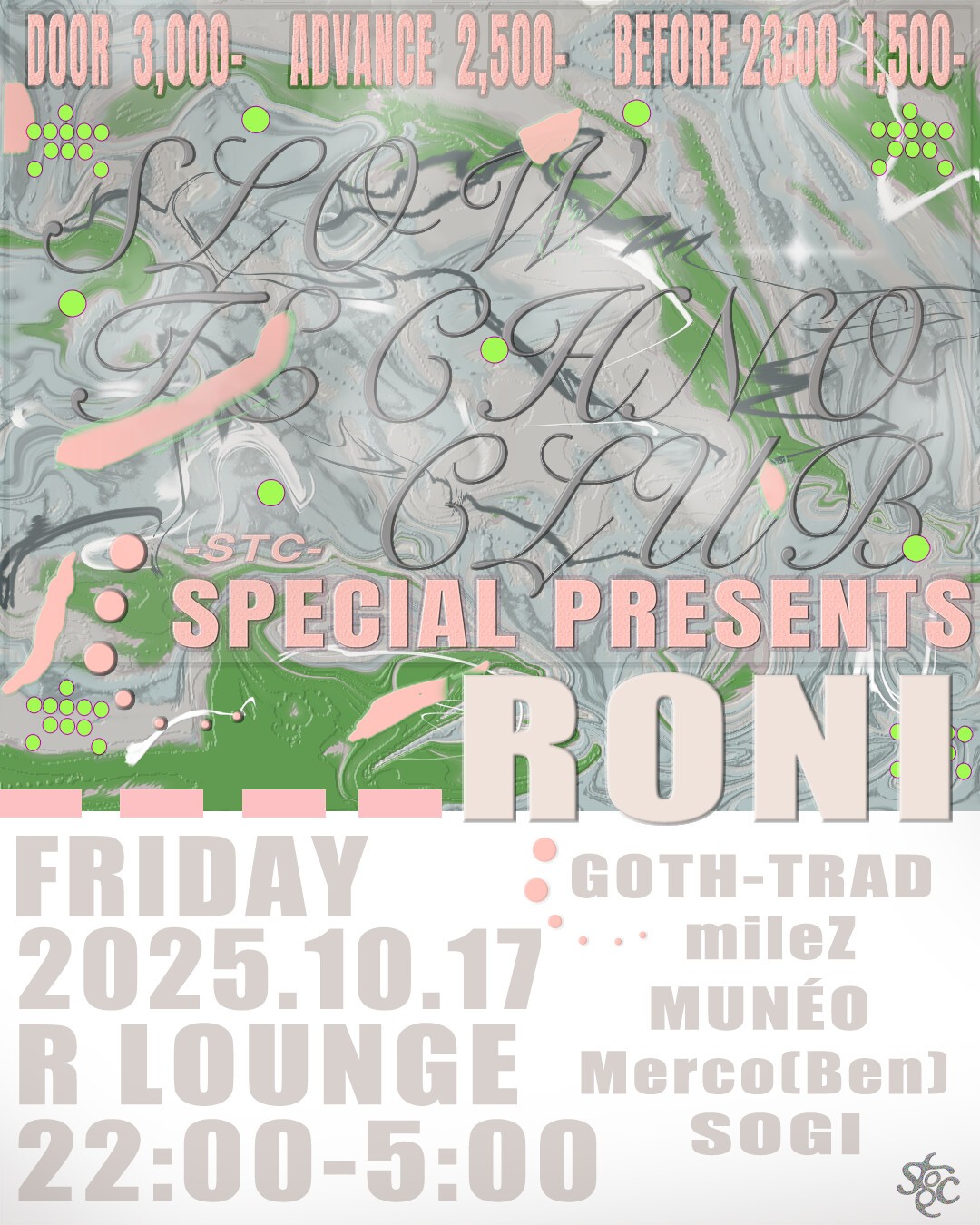 STC is a party series curated by SOGI, now in its third Tokyo edition, known for its fast-paced and driving techno/bass sound. As an open admirer of RONI, SOGI’s musical direction and the party’s high-octane atmosphere make for a perfect synergy with RONI, promising an aggressive yet uplifting sonic experience.