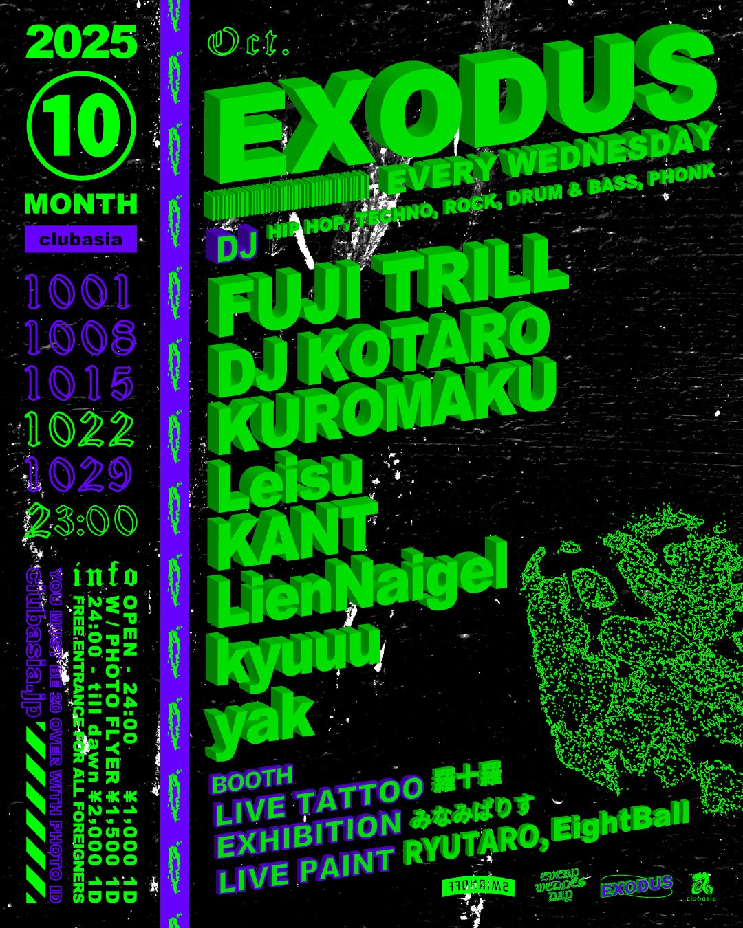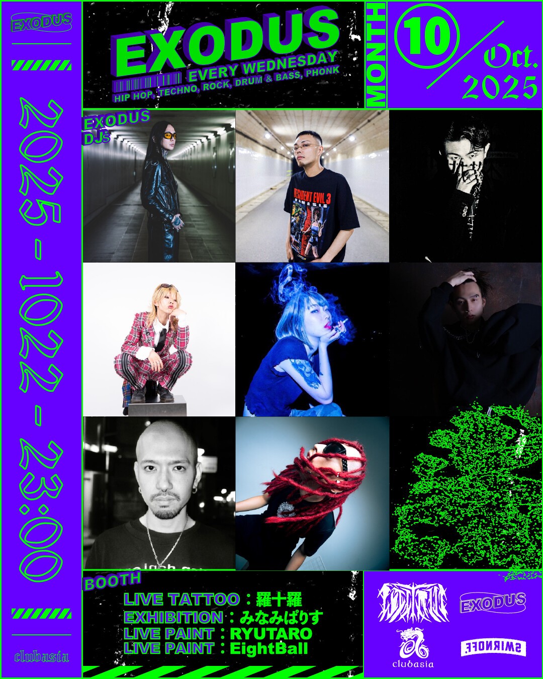 ✸ FUJI TRILLをはじめ多方面に活躍するDJ , BeatMakerが毎週水曜の渋谷の夜をにぎわす通称"エクソ"。隔週のLIVE PAINT, LIVE TATTOO, EXHIBITIONも充実したLINEUPでお届け。9月にはVol.200も超え渋谷の夜に混沌を刻み続ける。10月は"多様な価値観""yak"が新たに参戦。最終週の10月にはEXODUSへ出演を続けてきた"itako"が海外渡航前に自身が主催する「GUNDARI」×「EXODUS」が開催される。