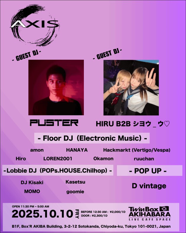 秋葉原にElectronic music Event 爆誕! 360° Boiler Room形式の没入型DJプレイで観客を魅了する! さらに!今回、「D vintage」が古着POPUPとしてコラボ! ロビーにて販売されます!たくさんのご来場お待ちしております。