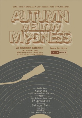CLUB創世記より活動し、初期MOVEでもレギュラーPLAYしていたNight PerformanceのNakajima氏と兵庫を中心に活動中のABE氏、奈良より現役専門学生でバイナルDJのgoodspoon氏が登場。MOVEでお馴染みのTetsuya Satoとエムケイの5人のRECORD DJ達が集います。