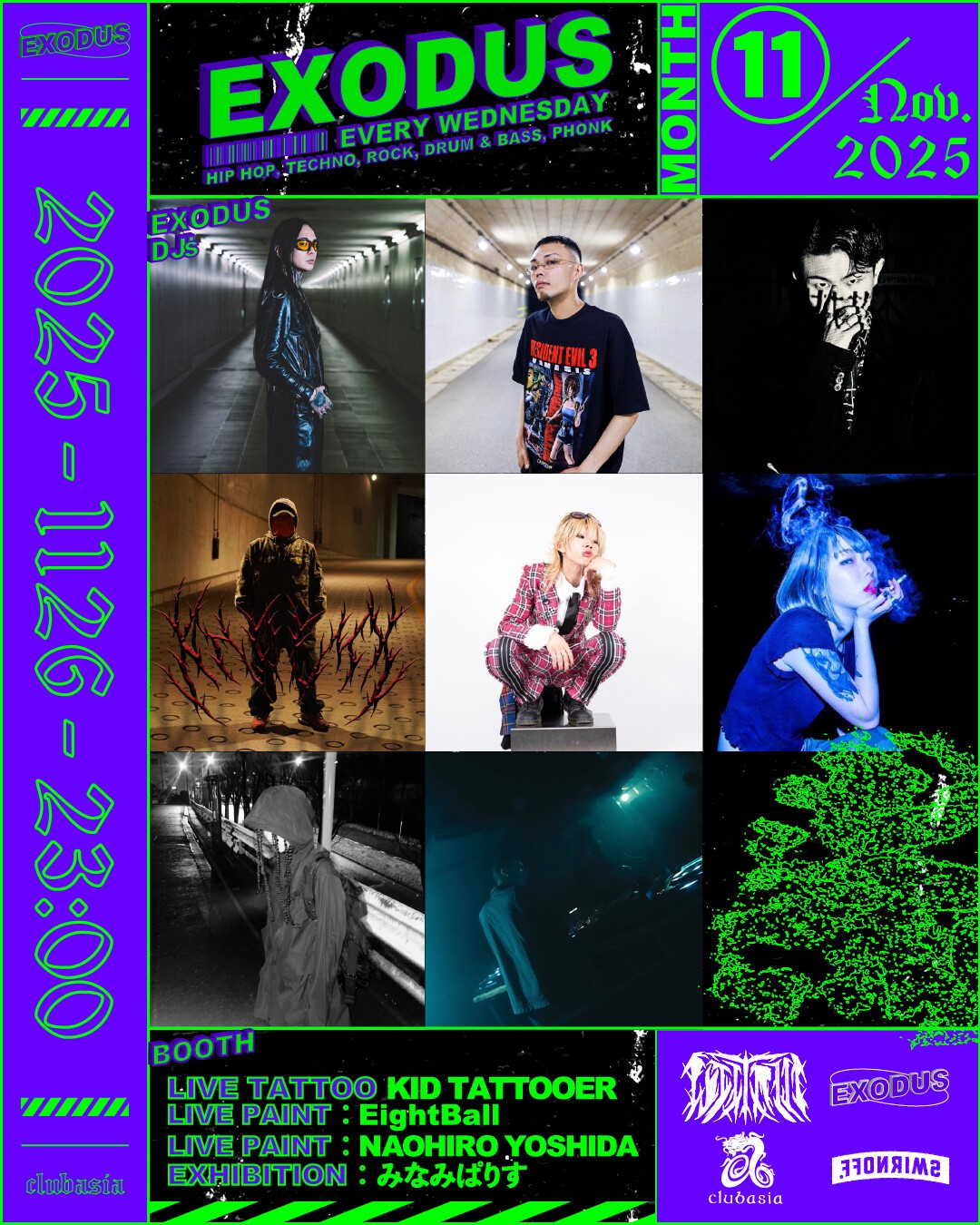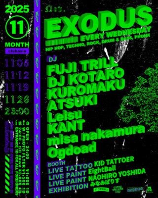 ✸ FUJI TRILLをはじめ多方面に活躍するDJ , BeatMakerが毎週水曜の渋谷の夜をにぎわす通称"エクソ"。隔週のLIVE PAINT, LIVE TATTOO, EXHIBITIONも充実したLINEUPでお届け