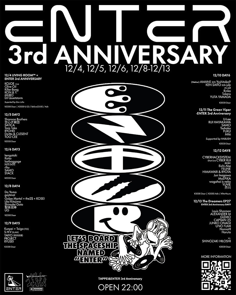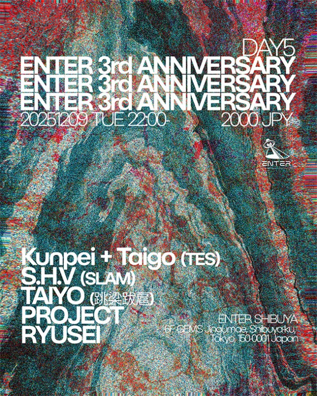 2022年12月15日にオープンしたENTER SHIBUYA。この度、3周年を祝した2週間に及ぶ9つのアニバーサリーパーティを開催。ENTERの3周年の記念に、平日・週末問わず盛大に盛り上げるパーティTES、SLAM、跳梁跋扈、PROJECT、RYUSEIが平日にスペシャル大集結!