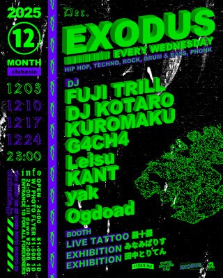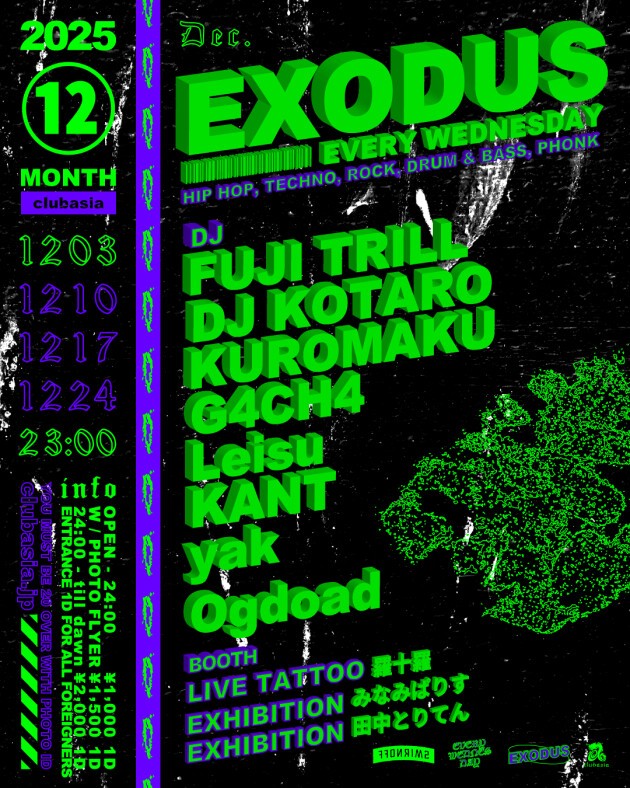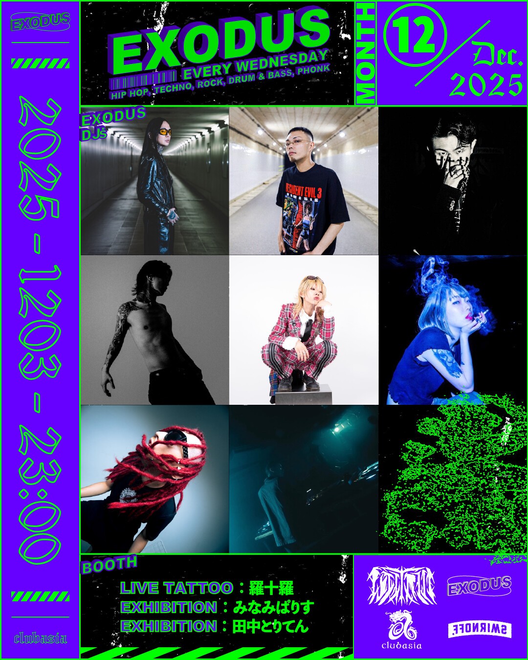 ✸ FUJI TRILLをはじめ多方面に活躍するDJ , BeatMakerが毎週水曜の渋谷の夜をにぎわす通称"エクソ"。12月のクリスマス期間中にはスペシャルな" X'ma TATTOO NIGHT"の開催が決定。隔週のLIVE PAINT, LIVE TATTOO, EXHIBITIONも引き続き充実したLINEUPでお届け