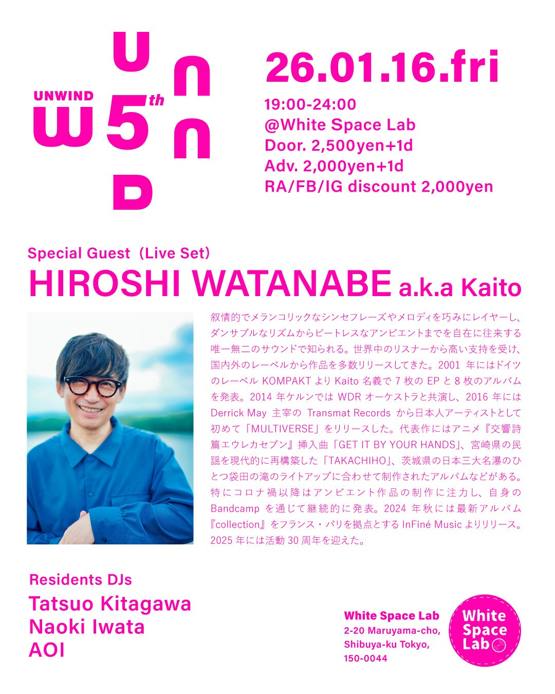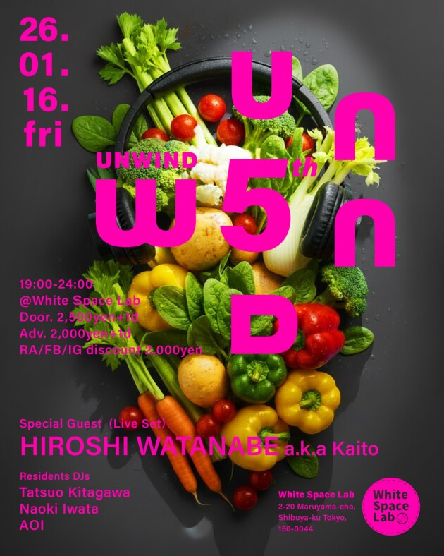 渋谷のアンダーグラウンドVenue @White Space Labでのディープハウスパーティ ”UNWIND” 心地良いディープハウスを軸にOrganic house / Downtempo, deep tech, electronica, ambientなどクロスオーバーに新しさと実験的且つモダンなサウンドを心地良く体感できるディープハウスパーティ”UNWIND”今回で5周年を迎えます!