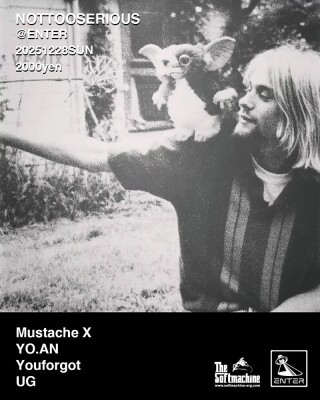シネマティックなスローテクノと卓越したキュレーション能力で、関東地下空間の中枢神経を担ってきたMustache X、ストリートカルチャーの渦中で活躍し、今や国内外で制作に携わる〈Hole and Holland〉の要 YO.AN、類稀なバイタリティで国内主要フェスには欠かせないサイケデリックの魔術師 You Forgot、ディープテクノだけでなくハウスやエレクトロ、アンビエントまで幅広いジャンルを自由自在に往来する松果体の主宰 UGが年の暮、ENTERに集結。