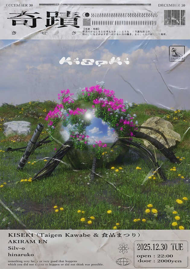 2025年も残り2日、Bo NingenのTaigen Kawabeと食品まつりa.k.a foodmanが巻き起こすKISEKI。都内要所のリスニングバーにてレジデントを務めるDJ、選曲家 AKIRAM EN、ロンドンを拠点に活動し、BALENCIAGA、KENZO、CARHARTT等のトップブランドのサウンドデザインをも手がけるコンポーザー、サウンドデザイナーのSilv-o、催眠グルーヴ変拍子マスターのhinarukoが登場。行く年来る年 去り行く師走を横目に立ち現れる幽玄郷にて、2025総決算の音楽体験を堪能せよ!