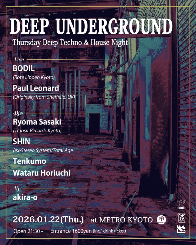 電気グルーヴのオープニングアクト等、精力的にクラブ・ライブハウスで活動を続け、アルバム「KÖRPERKOMPLEX」も好調なEBM/New Wave ライブ・アクト『BODIL』、そして、Tresor.Berlin、Renate、Ipse、Golden Gate 等々、ベルリンのトップ・クラブに出演し、コンスタントに楽曲をリリース (これまでに Scot Grooves, Tyree Cooper など著名DJがプレイ)、レーベル Transit Records Kyotoや京都や大阪でイベントを主宰する『Ryoma Sasaki』、Juan Atkins、Santiago Salazar、DJ3000 等のデトロイト勢アーティストを京都に招聘するなど数多くのイベントを手掛け、2024年から Music Bar "S-pod"を運営する『SHIN』の他、強力レギュラー陣が出演します!