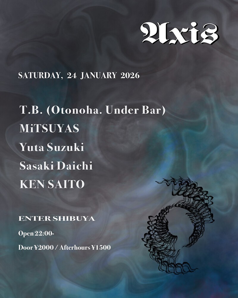 今年24周年を迎えるパーティotonohaを福岡にて主催し、〈Otonoha Recordings〉を運営するT.B.の2度目のENTER出演、さらに2020年 レコードにフォーカスしたプロジェクトDiGDUGを指導した大阪の実力者MiTSUYASがENTER初登場。加えて不定期開催中のパーティmisty主催のYuta Suzuki、コズミックなエレクトロスタイルで渋谷を拠点に活動場所を広げるSasaki Daichiを迎える。
