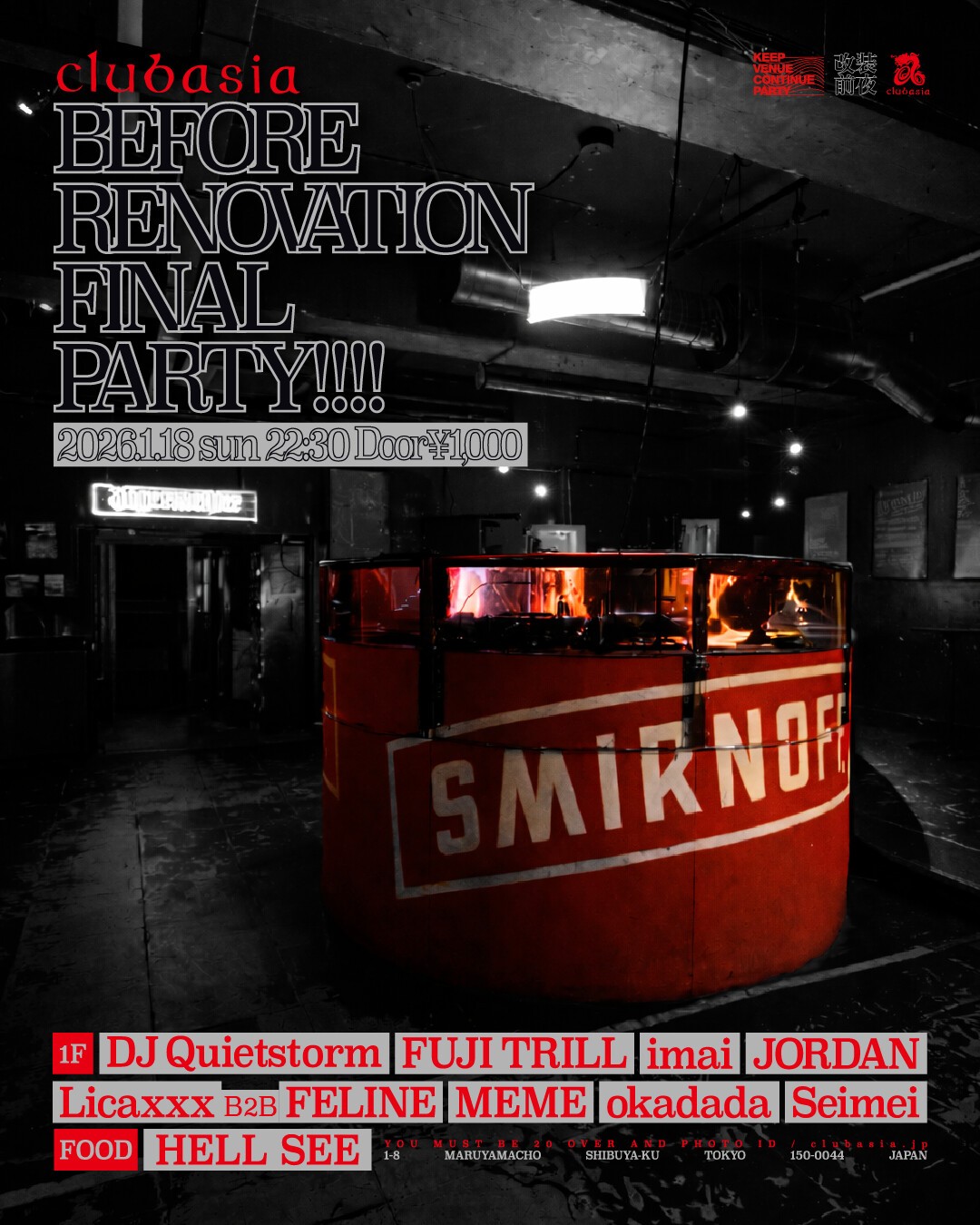 ✸「改装前夜」 改装がアナウンスされ夜な夜なボルテージが高まるclubasia。解体が始まるその瞬間まで終わらないパーティーで全てを見届けよう ────────。