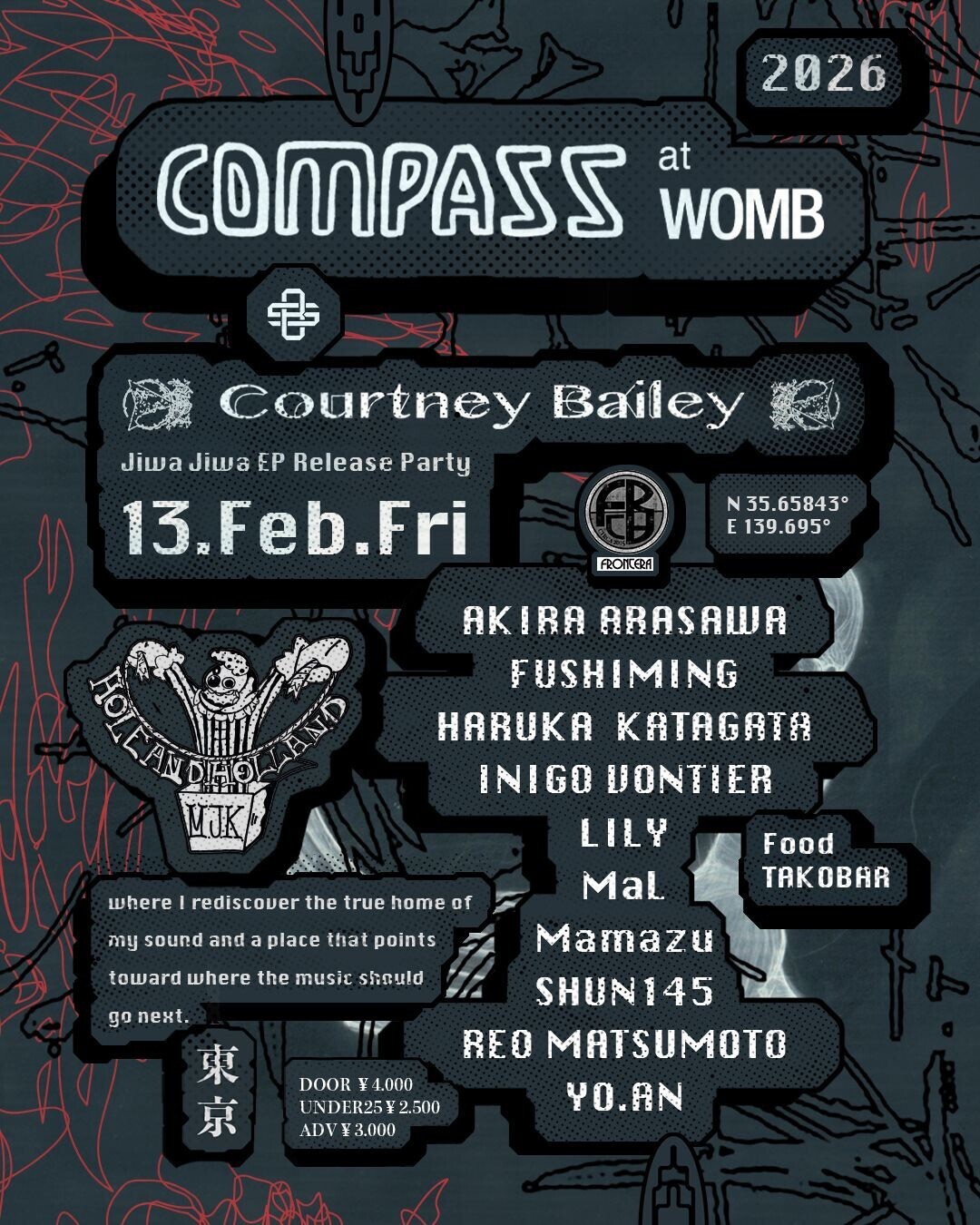 COMPASS, a party curated by four forward-thinking forces — Tokyo-based label and creative collective HOLE AND HOLLAND, SABI led by Mamazu, handpan player and producer REO MATSUMOTO, and the newly launched cross-regional project FRONTERA — will take place at WOMB on Friday, February 13, 2026.