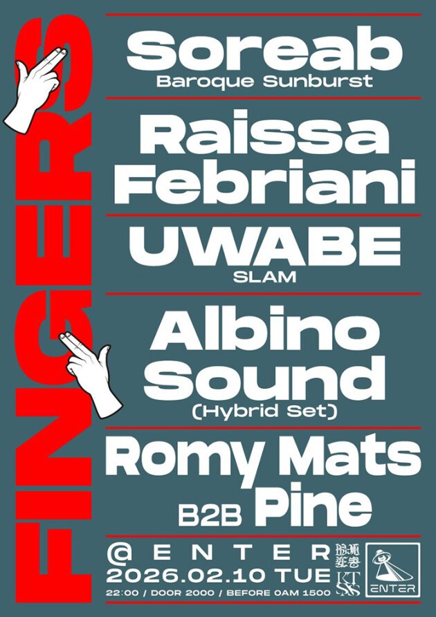 Romy MatsとAlbino SoundsによるFingersが、ロンドン〈Baroque Sunburst〉のSoreab、バリを拠点にするDJ/プロデューサーRaissa Febrianiを招聘。ローカルからは〈Hekdb〉のファウンダーPineと次世代パーティSLAMよりUWABEがラインナップ。