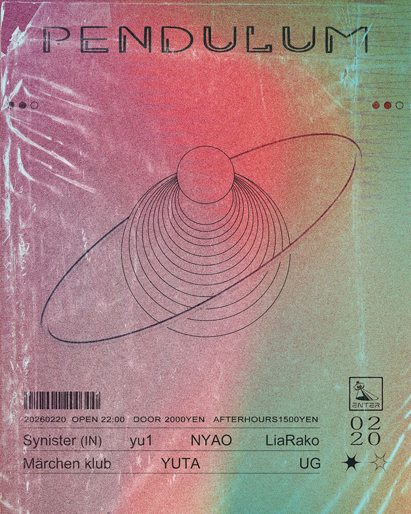 テクノシーンのさらなる拡張を目的に、先進気鋭のアプローチとキュレーションで国内最高峰のレーベルとなったサイケデリックテクノのオリジネーター〈Liquid Drop Groove〉主宰のYUTAと、ディープテクノパーティ松果体の主導者UGが始動したPendulum。6回目となる今回、インドよりSynisterを招聘。