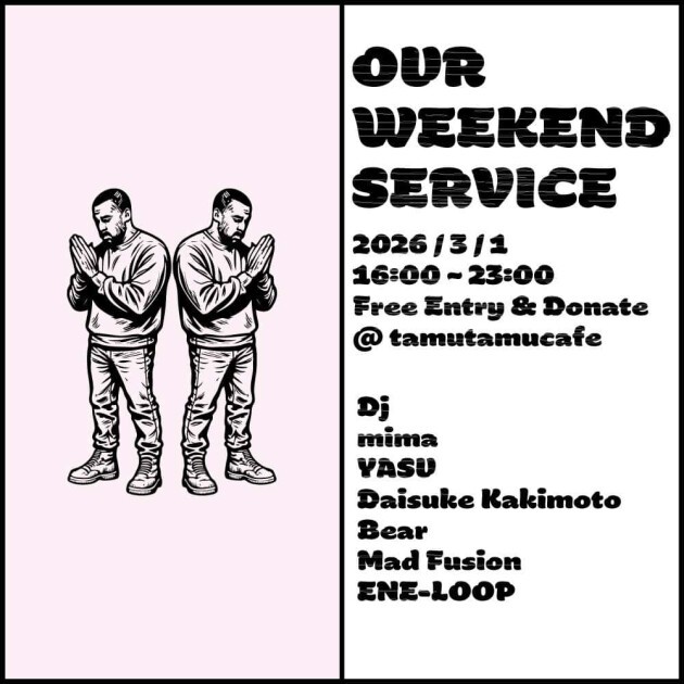 前回のPartyも大盛況!実力派ハウスDJのDaisuke Kakimoto、Mad Fusion、Bear、ENE-LOOPの4人によるParty『OUR WEEKEND SERVICE』がゲストを迎え久しぶりにtamutamucafeで開催してくれます!早い時間からのオープンなので日曜日の午後をゆるっとグッドミュージックで楽しみに来て下さい。入場無料投げ銭制です。