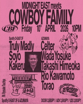 Joining Truly Madly for his first gig in Japan is Korean selector Soyo, also making her Japan debut. A resident at Itaewon’s night club Hertz and curator of the party series Time Illusion, she effortlessly traverses genres including techno, house, and electro. Opening the O-EAST 3F floor will be Kakeru, the youngest member of COWBOY FAMILY.