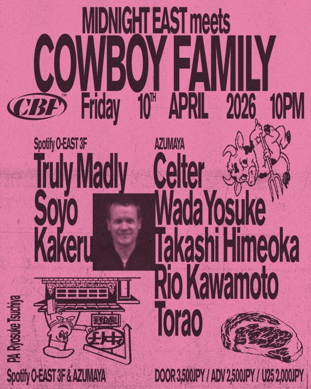 This marks the second collaboration between Tokyo-based party and label COWBOY FAMILY and MIDNIGHT EAST since November 2024, when we invited Sugar Free and Fonte for their Tokyo debuts.