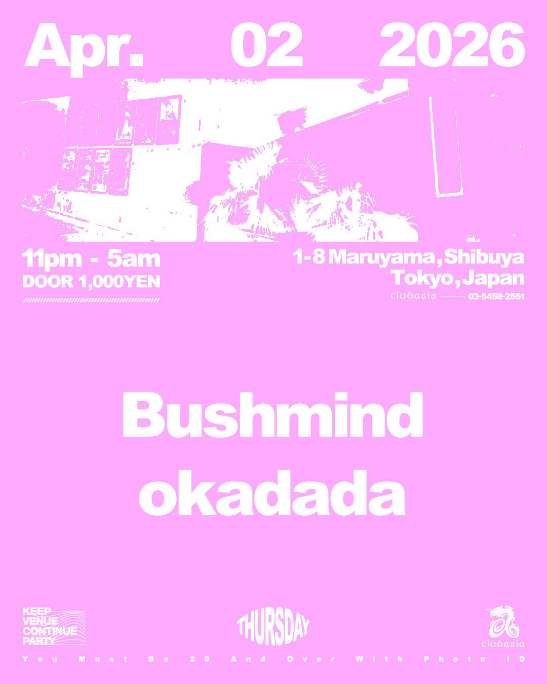 ✷ 密かな賑わいを見せる"木曜日"の始まりとなった奇数月第一はDJのokadadaキュレーションによる開催。30周年を迎えたばかりのclubasiaに”PSYCHEDLIC B-BOY” "Bushmind"が登場で予測不能な2人会が実現。お見逃しく