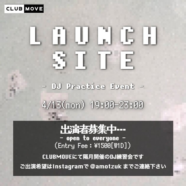 LAUNCH SITE is a practice-based event where you can practice DJing and live performances. It is open to a wide range of participants, from beginners to those who want to deepen their skills. Our goal is to create a space where individuals can not only improve their skills but also share their favorite music. (Even those who have never DJed before are welcome. We provide practice time and can teach you the basic operations. In addition to DJing, you can also practice machine live performances, etc.) If you wish to perform, please contact us on Instagram @amotzuk.