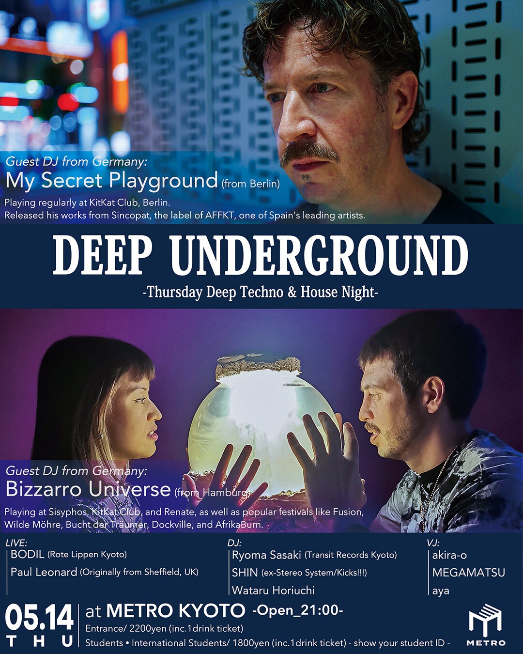 My Secret Playgroundは、ウィーン発、現在はベルリンに拠点を移し、ベルリンの名物クラブ・KitKat Clubに定期的に出演、スペインを代表するアーティストの1人である AFFKT のレーベル Sincopat をはじめ Jeahmon, Melopee Records などからリリースを重ね精力的に活動している。そして、現在、ドイツを中心に人気急上昇中のBizzarro Universeは、Sisyphos、KitKat、Renate といったベルリンを象徴するクラブをはじめとして、Fusion, Wilde Möhre、Bucht der Träumer、Dockville、AfrikaBurnといった人気フェスティバルに出演、作品も Exploited、Bordello a Parigi、Discotexas、Nein Recordsといったレーベルからリリース、著名トレンドセッターたちから支持を集めている。木曜のスペシャルな京都の夜を是非堪能してください!