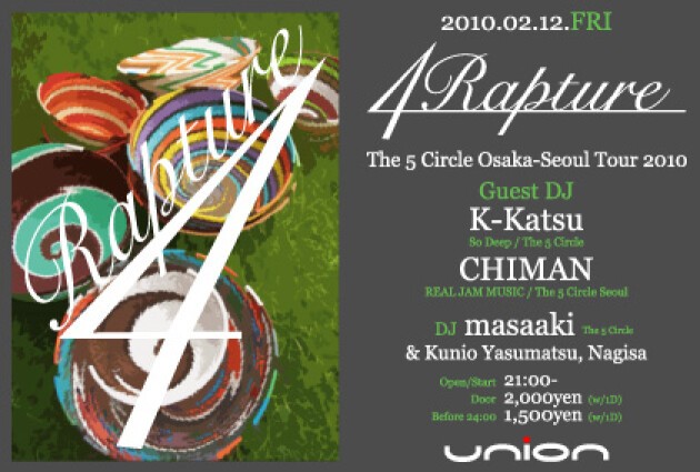 今回は"The 5 Circle Osaka-Seoul Tour 2010"と題して"The 5 Circle Seoul"のDJであり、自身のレーベル"REAL JAM MUSIC"主宰DJ CHIMANと、"The 5 Circle"の盟友DJ K-KatsをGUESTに迎えての開催!!!