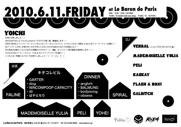 We reprise the highly successful nighttime hipster flea market concept returns with Mademoiselle Yulia presents “YOICHI” Vol. 2 @ Le Baron de Paris! From 21:00~23:00 it is flea market time: all those in attendance get the chance to purchase very rare items and sample unusual treats including special Japanese sweets. From 23:00, the night cedes into a funky party, just like with some big-hitting DJs. Come and join us for a night slightly different from the norm …