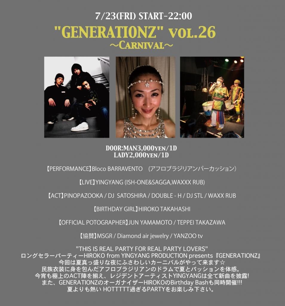 ロングセラーパーティー、HIROKO from YINGYANG PRODUCTION presents『GENERATIONZ』今回は、夏真っ盛りな夜にふさわしい、カーニバルがやって来ます!