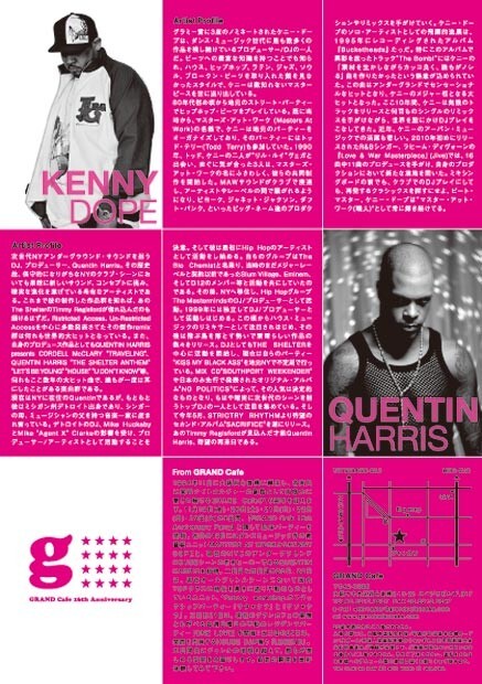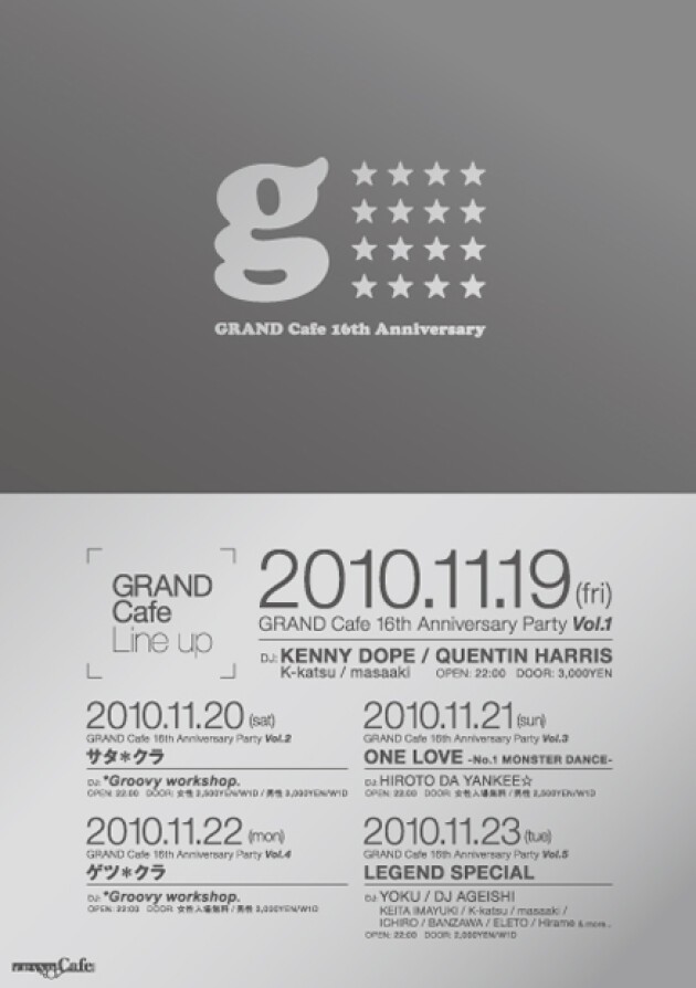 1994年11月に大阪西心斎橋に誕生し、名実共に関西ナイトカルチャーの象徴として皆様方に愛され続けるGRAND Cafeが16周年を迎えます。11月19日(金)・20日(土)・21日(日)・22日(月)・23日(火)の5日間、『GRAND Cafe 16th Anniversary Party』と題して記念パーティーを開催。初日の19日にはダンスミュージック界の最重要ユニットMASTERS AT WORKからKENNY DOPEと、現在のNYCのアンダーグラウンドHOUSEシーンの若きヒーローであるQUENTIN HARRISを招聘。二日目と四日目の20日、22日は、現在オールジャンルシーンにおいて国内TOPクラスの地位を長きに渡り不動のものとしているユニット、*Groovy workshop.のフラッグシップパーティー「サタ*クラ」と「ゲツ*クラ」。三日目21日は、現在のグランカフェの象徴とも呼べる毎週日曜日の不動のレジデンツパーティー「ONE LOVE」を開催!五日目の23日は、関西を代表するHOUSE DJが集う「LEGEND」。五日間共にジャンルの垣根を超えて、誰もが楽しめる空間をお届けします。最高の瞬間を是非体験してみて下さい。1994年11月に大阪西心斎橋に誕生し、名実共に関西ナイトカルチャーの象徴として皆様方に愛され続けるGRAND Cafeが16周年を迎えます。11月19日(金)・20日(土)・21日(日)・22日(月)・23日(火)の5日間、『GRAND Cafe 16th Anniversary Party』と題して記念パーティーを開催。初日の19日にはダンスミュージック界の最重要ユニットMASTERS AT WORKからKENNY DOPEと、現在のNYCのアンダーグラウンドHOUSEシーンの若きヒーローであるQUENTIN HARRISを招聘。二日目と四日目の20日、22日は、現在オールジャンルシーンにおいて国内TOPクラスの地位を長きに渡り不動のものとしているユニット、*Groovy workshop.のフラッグシップパーティー「サタ*クラ」と「ゲツ*クラ」。三日目21日は、現在のグランカフェの象徴とも呼べる毎週日曜日の不動のレジデンツパーティー「ONE LOVE」を開催!五日目の23日は、関西を代表するHOUSE DJが集う「LEGEND」。五日間共にジャンルの垣根を超えて、誰もが楽しめる空間をお届けします。最高の瞬間を是非体験してみて下さい。