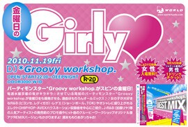 毎週水曜京都の夜がキラキラ☆させている周知のパーティモンスター*Groovy workshop.が金曜日をも爆発させる。選曲はもちろんオールミックス♪♪女の子が大好きな R&B(ビヨンセ、レディガガ)・レゲエ(ショーンポール、TOK)やオシャレに盛り上がれる エレクトロHIPHOP・AVEXハウスネーション収録曲を中心にご紹介。 J-R&B(加藤ミリヤ)等の人気アーティストの発売前のプロモ曲やヒット曲のグルービー ワークショップオリジナル激アゲREMIXバージョンもかかりますよ! 週末ももりあがっちゃお!