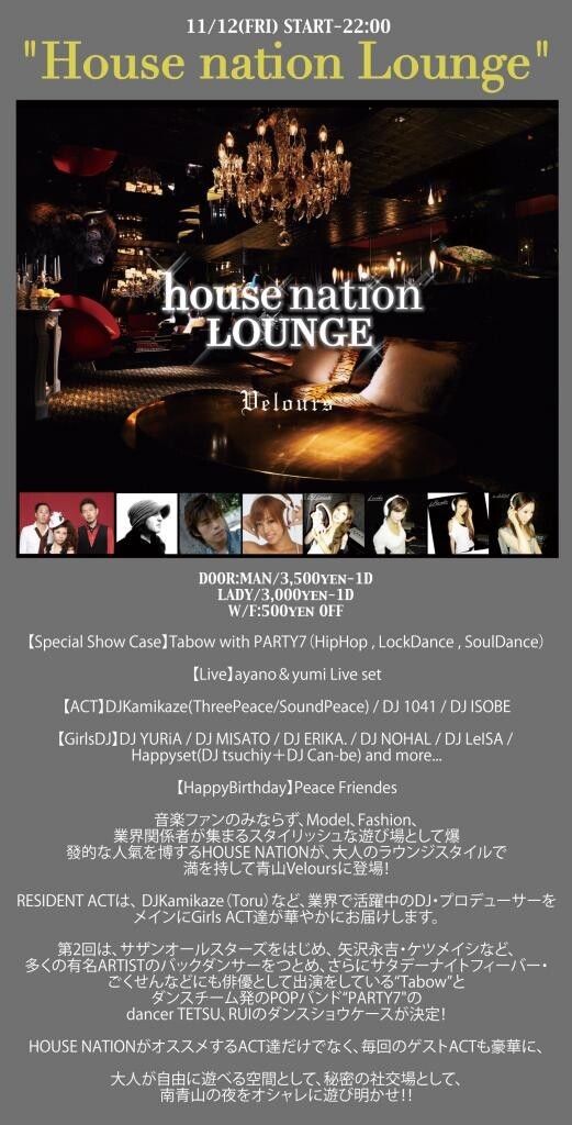音楽ファンのみならず、model、Fashion、業界関係者が集まるスタイリッシュな遊び場として爆発的な人気を博するHOUSE NATIONがお届けする大人のラウンジ・スタイル★
