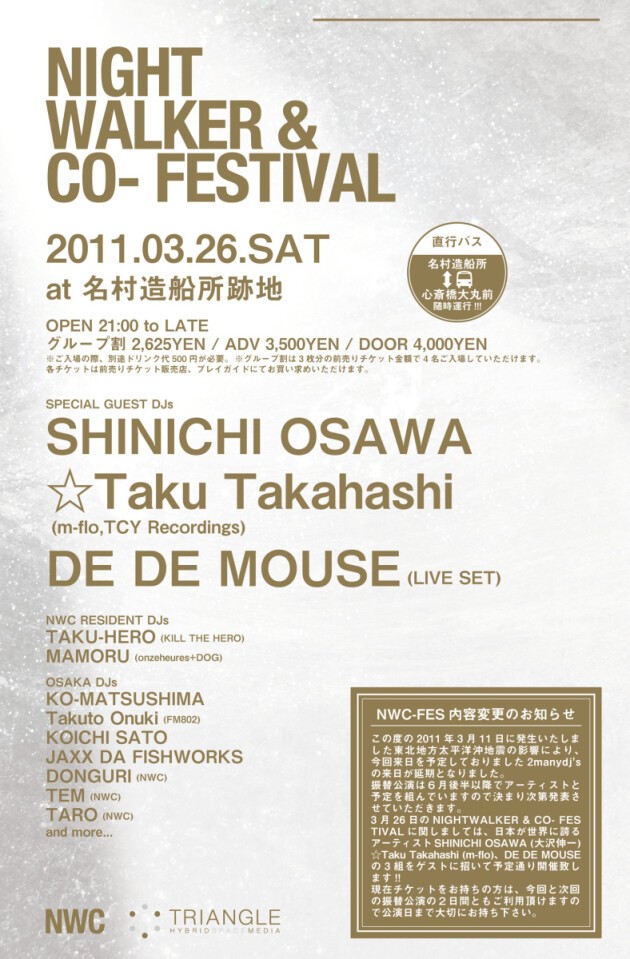 日本が世界に誇るアーティストSHINICHI OSAWA、☆Taku Takahashi、DEDE MOUSEの3組をゲストに招いて予定通り開催です!!