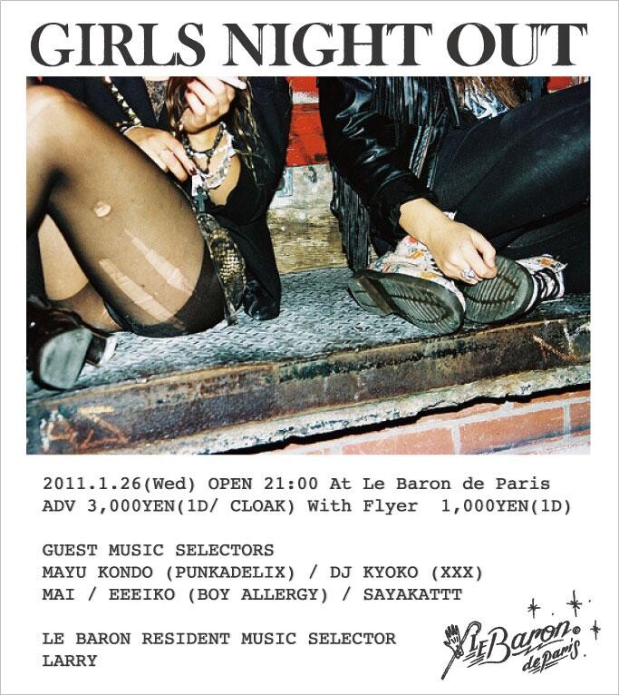 Art director Mayu Kondo, DJ Kyoko party reporter Mai-chan and Eikooo from girls DJ unit BOY ALLERGY are headlining the first all-girl night at Le Baron de Paris in 2011. Girls of all persuasions should come on down and have fun!!