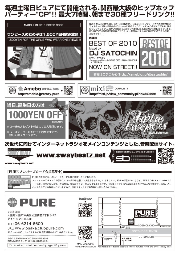 3月11日(金)より一週間をめどに、Pure Osakaでは東北地方太平洋沖地震で被害に遭われた方へ入場料の一部を募金致します。皆様のご協力、ご支援よろしくお願い致します。