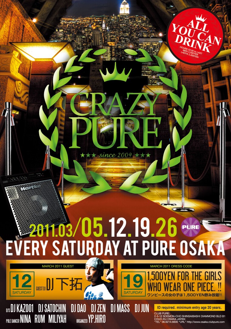 毎週600人オーバーで満員御礼のPUREの土曜日『 CRAZY PURE 』!!