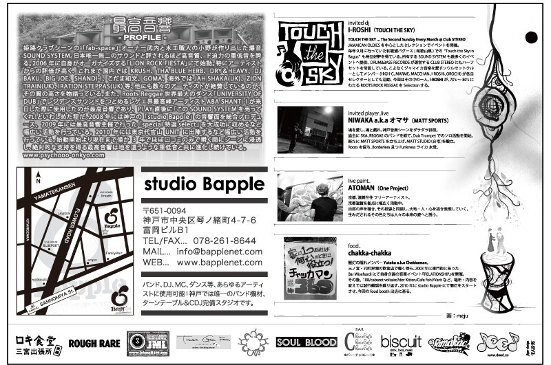 メンバー(HIGH-C、MARME、MACCHAN、I-ROSHI、OROCHI)が各自セレクターとしても活動、気持ちの良い音を求め続けているヴァイナル愛好家でもある。 今回はそのうちの一人、I-ROSHIが70's?80’sにわたるROOTS ROCK REGGAEをSelection。