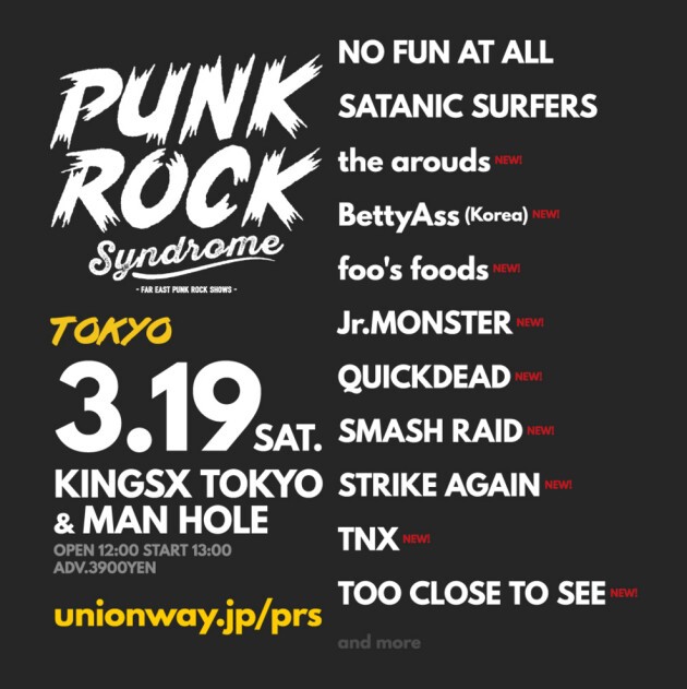 Lineup : NO FUN AT ALL SATANIC SURFERS / the arouds / BettyAss (Korea) / foo's foods / Jr.MONSTER / QUICKDEAD / SMASH RAID / STRIKE AGAIN / TNX / TOO CLOSE TO SEE / GOOD4NOTHING / ONE BUCK TUNER / OWEAK / XRADE / and more...