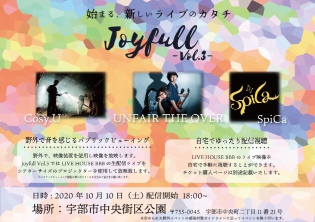 山口県宇部市にあるLIVE HOUSE BBBから配信ライブを行い、そこから徒歩100メートルの場所にある、中央街区公園(山口県宇部市中央町2丁目11−21)に設置される大きなプロジェクターを使用し、パブリックビューイングや物品販売も同時に行います。